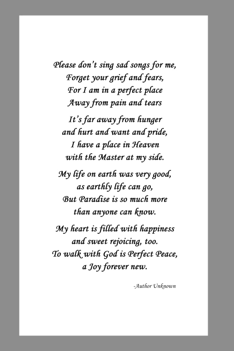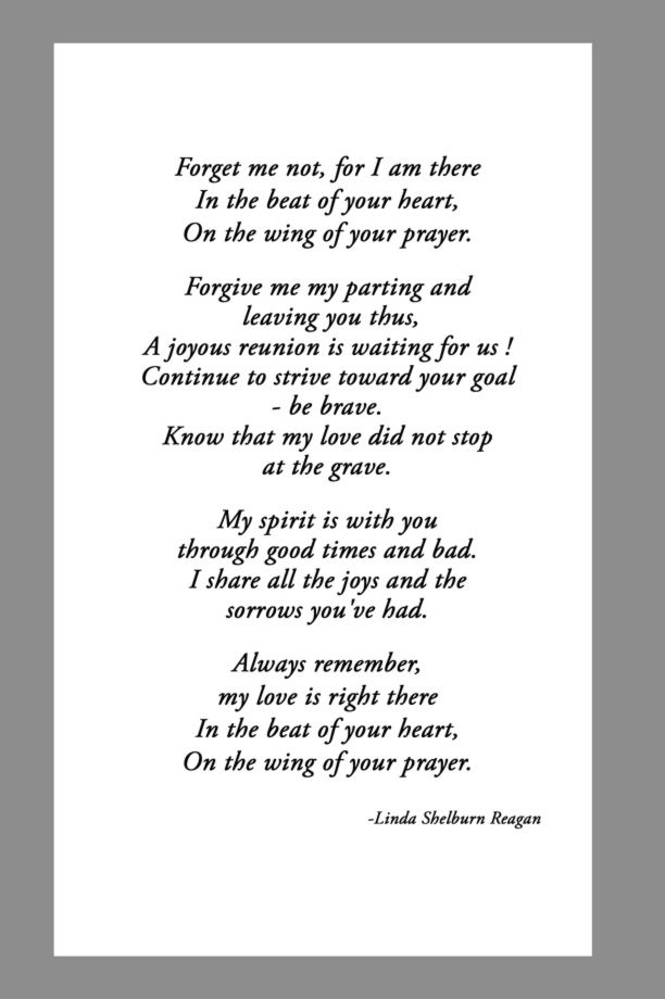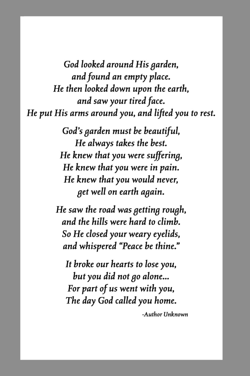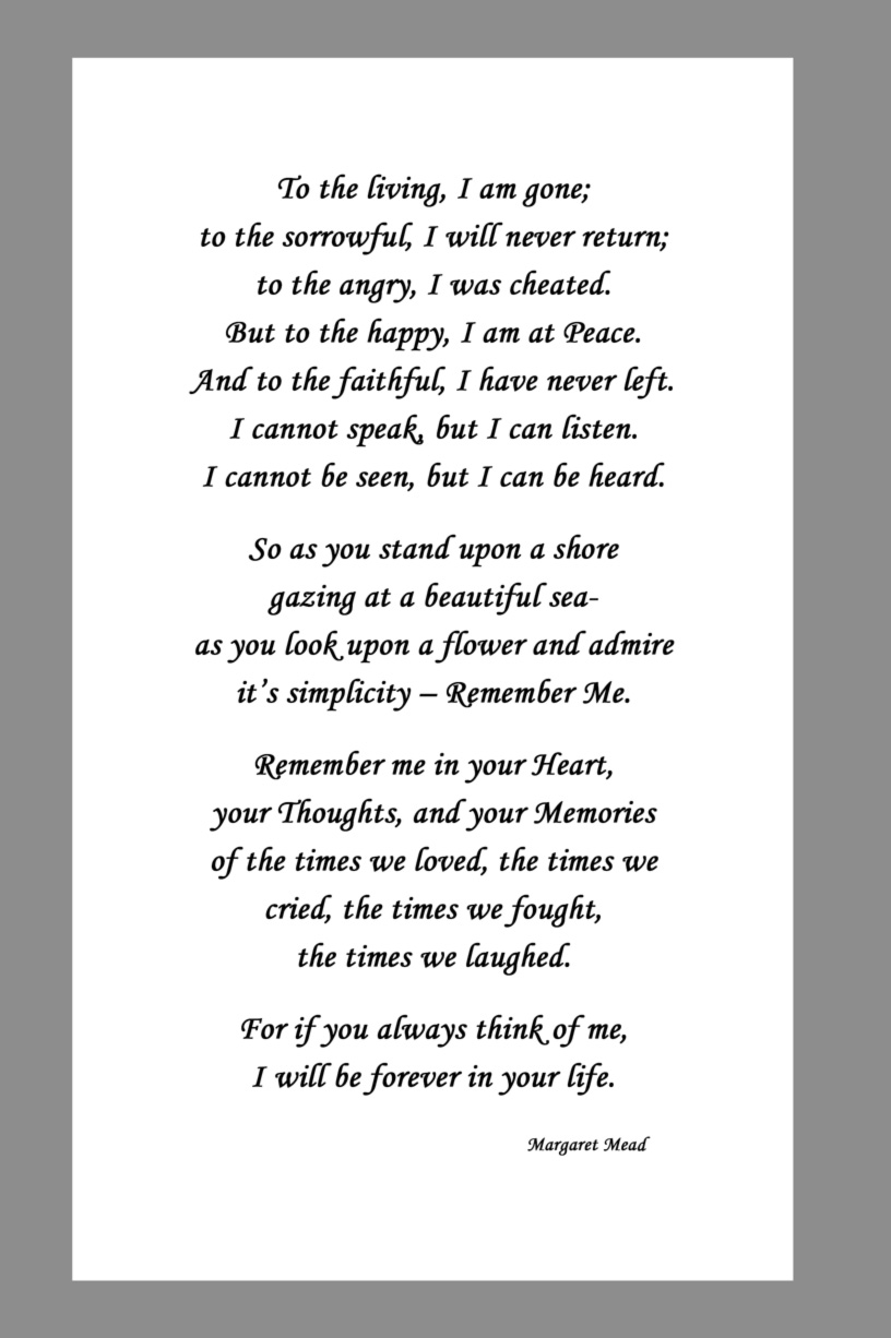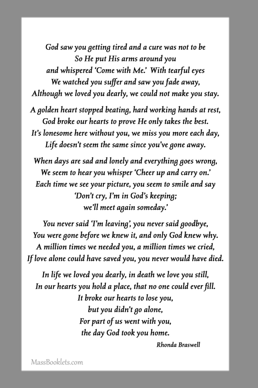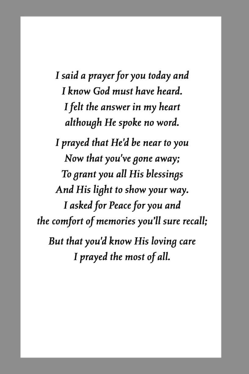 Below are some examples of Prayer Card Verses, Poems, and Prayers for Memorial card Backs. See Poems and Verses for a longer list of poems.