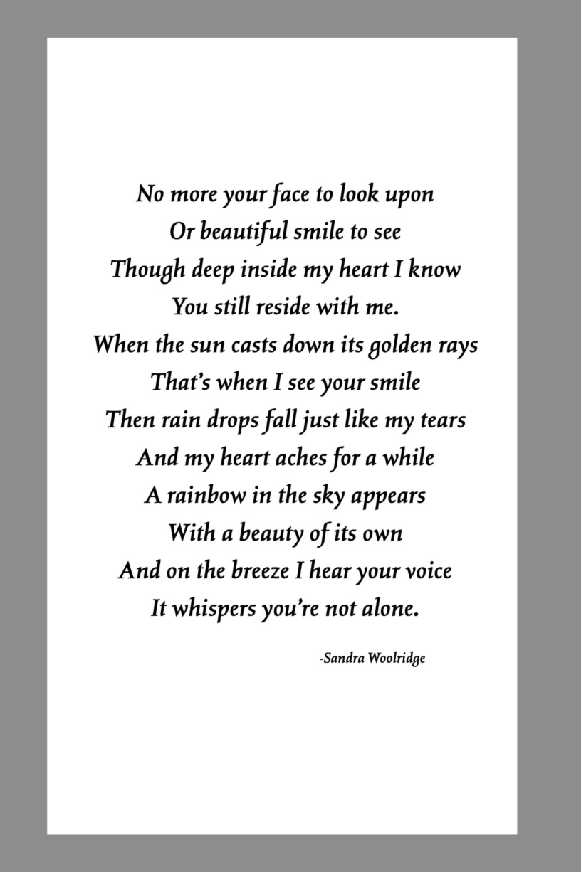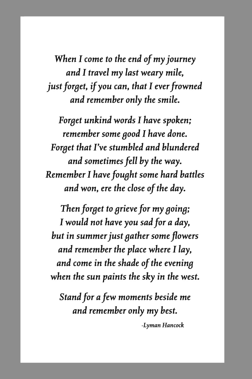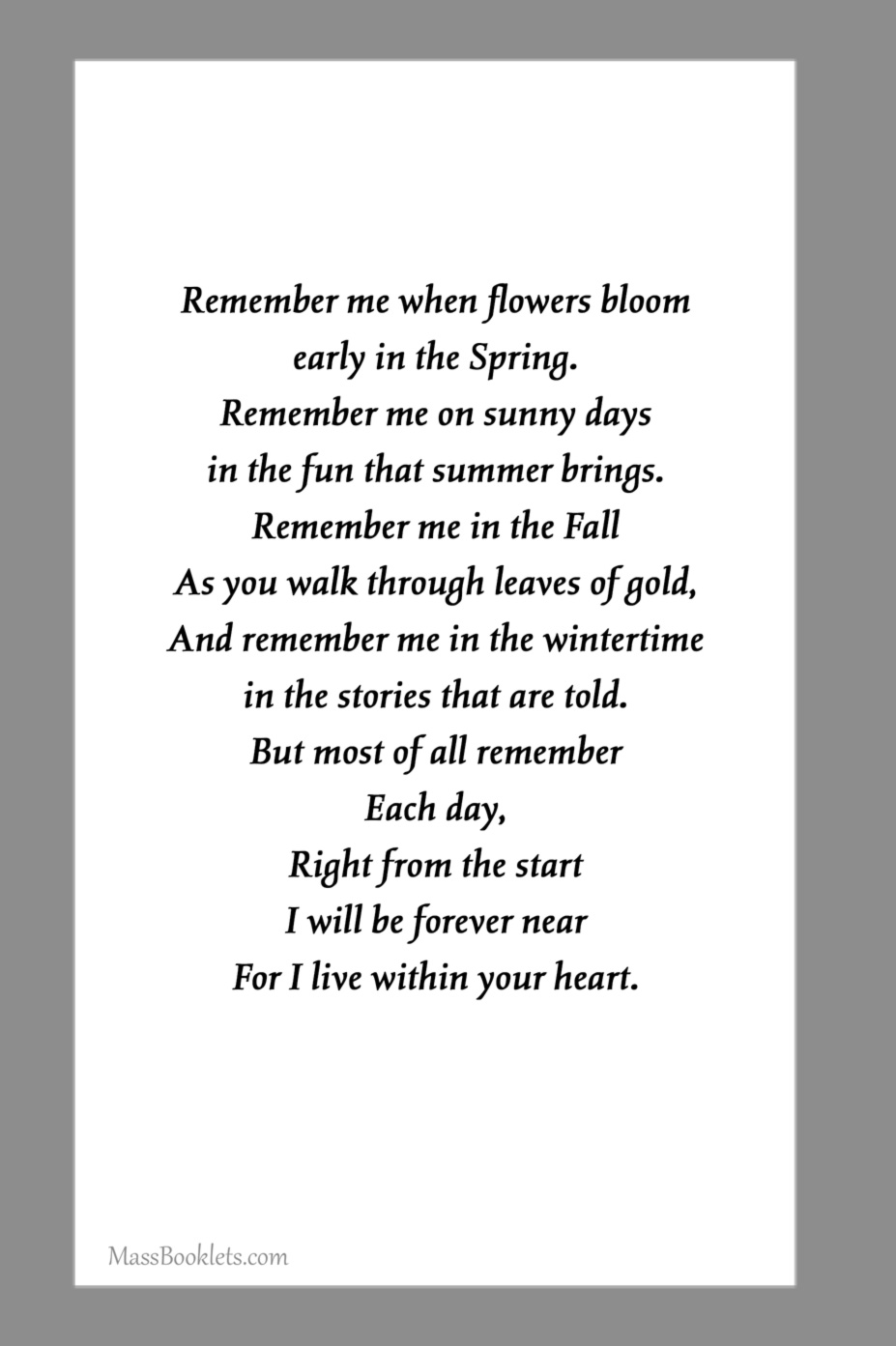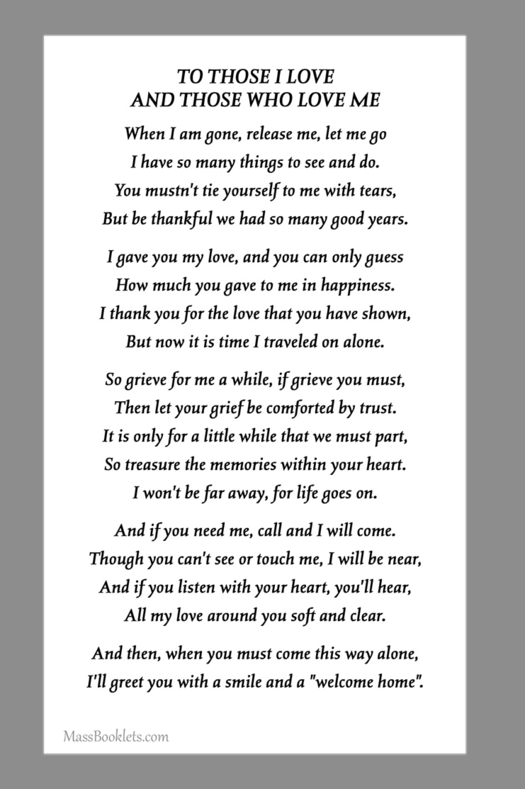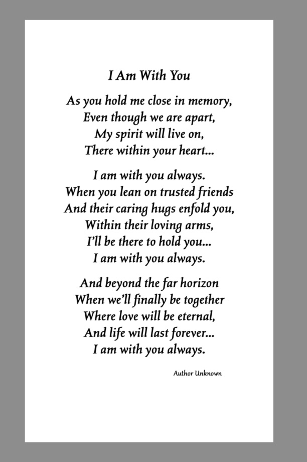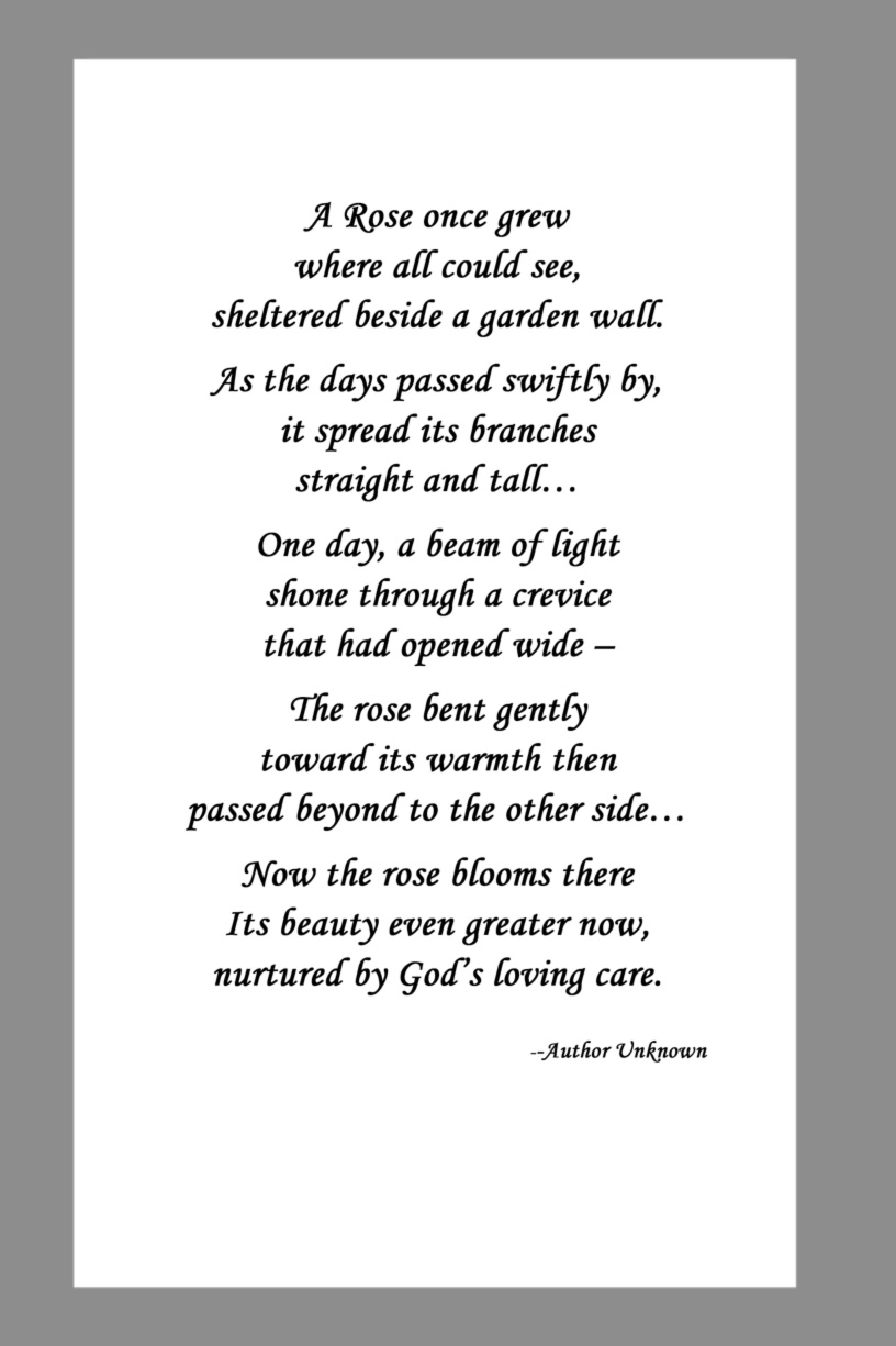 Below are some examples of Prayer Card Verses, Poems, and Prayers for Memorial card Backs. See Poems and Verses for a longer list of poems.