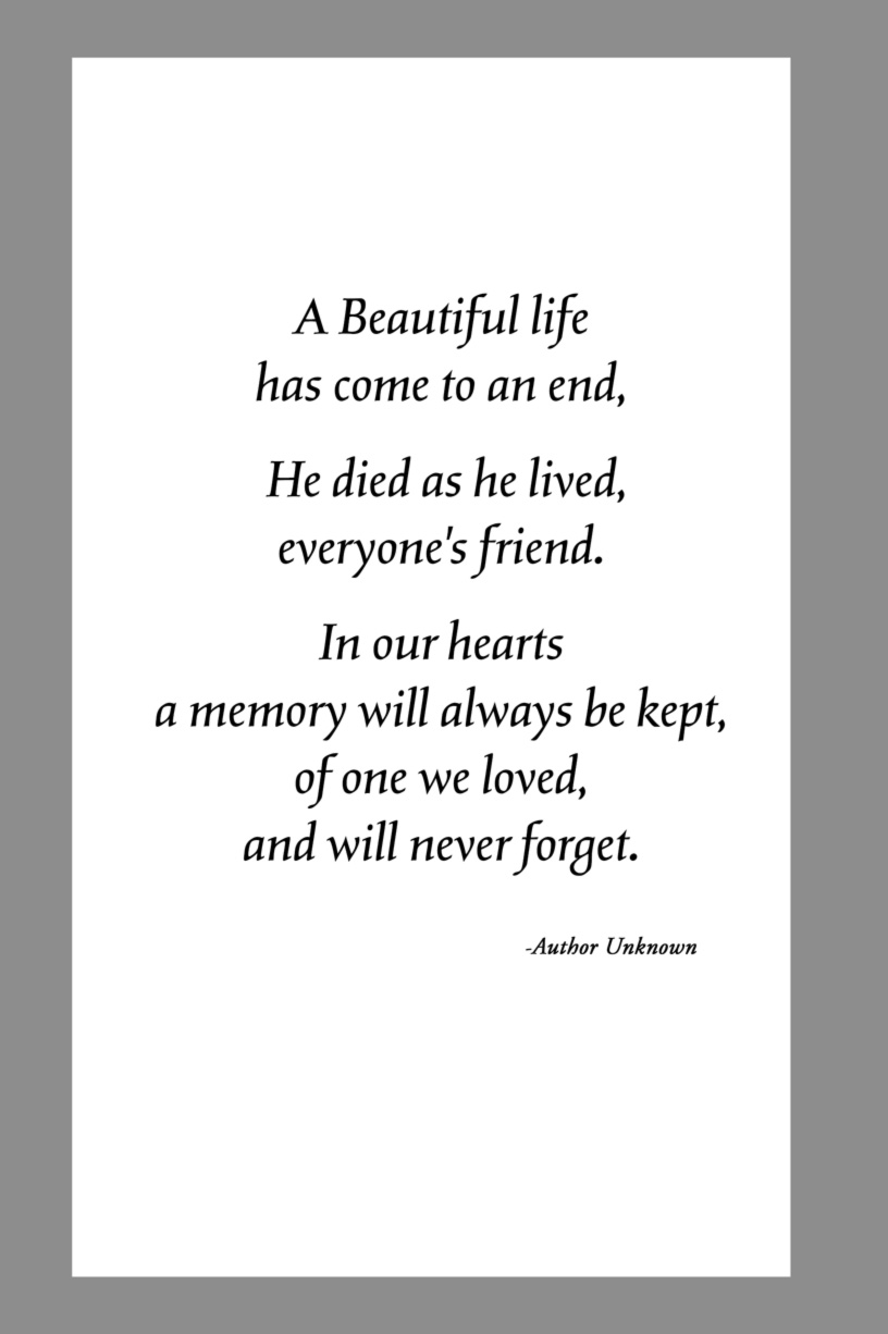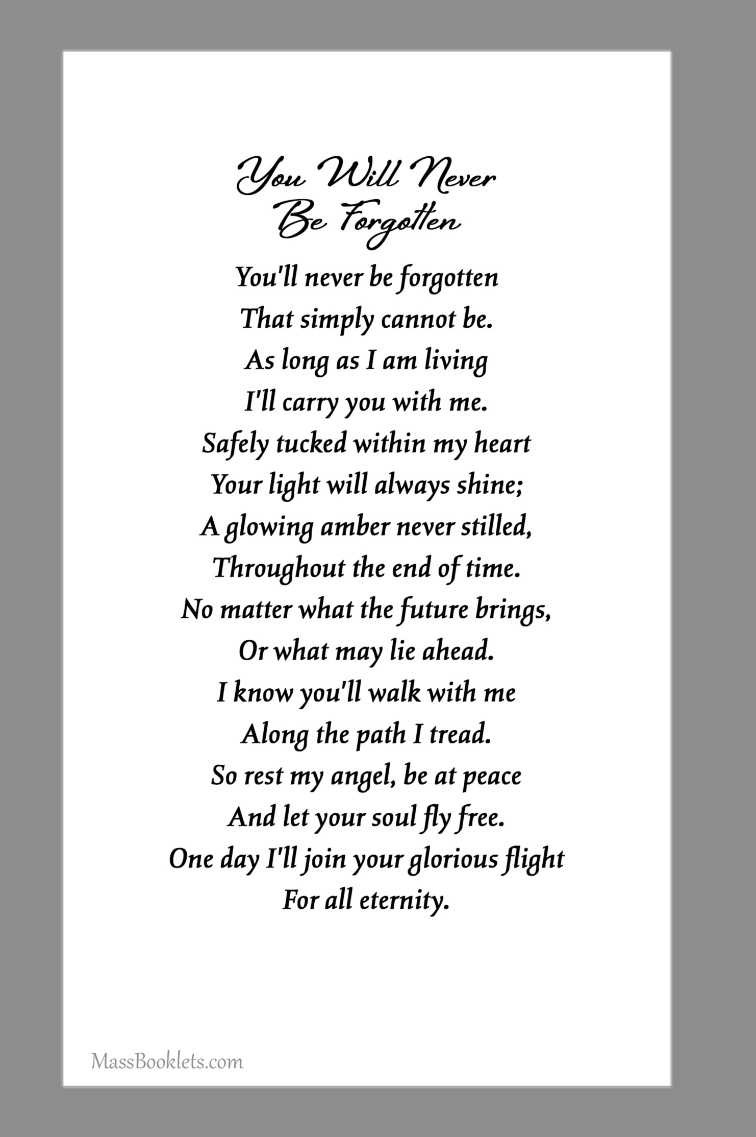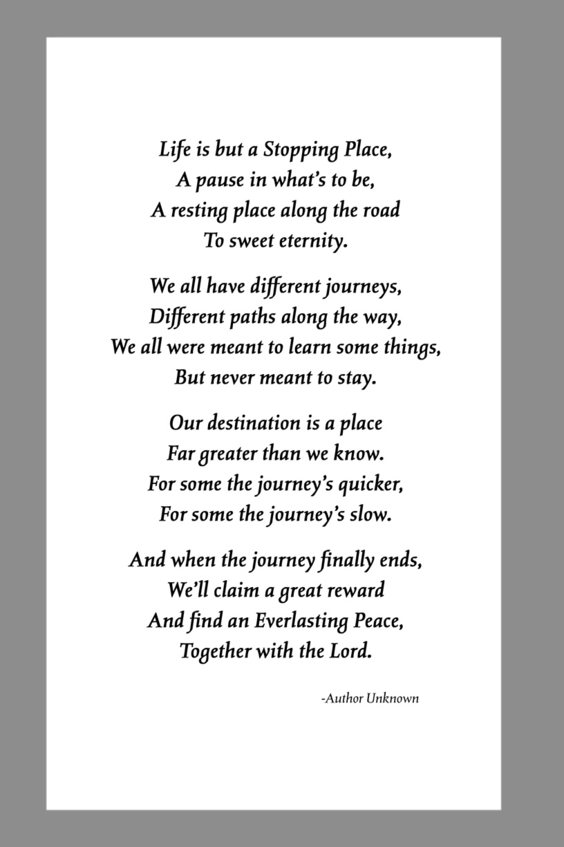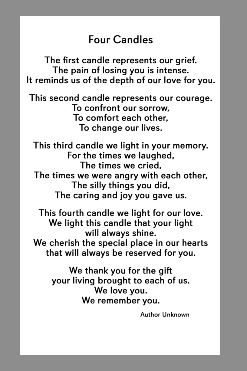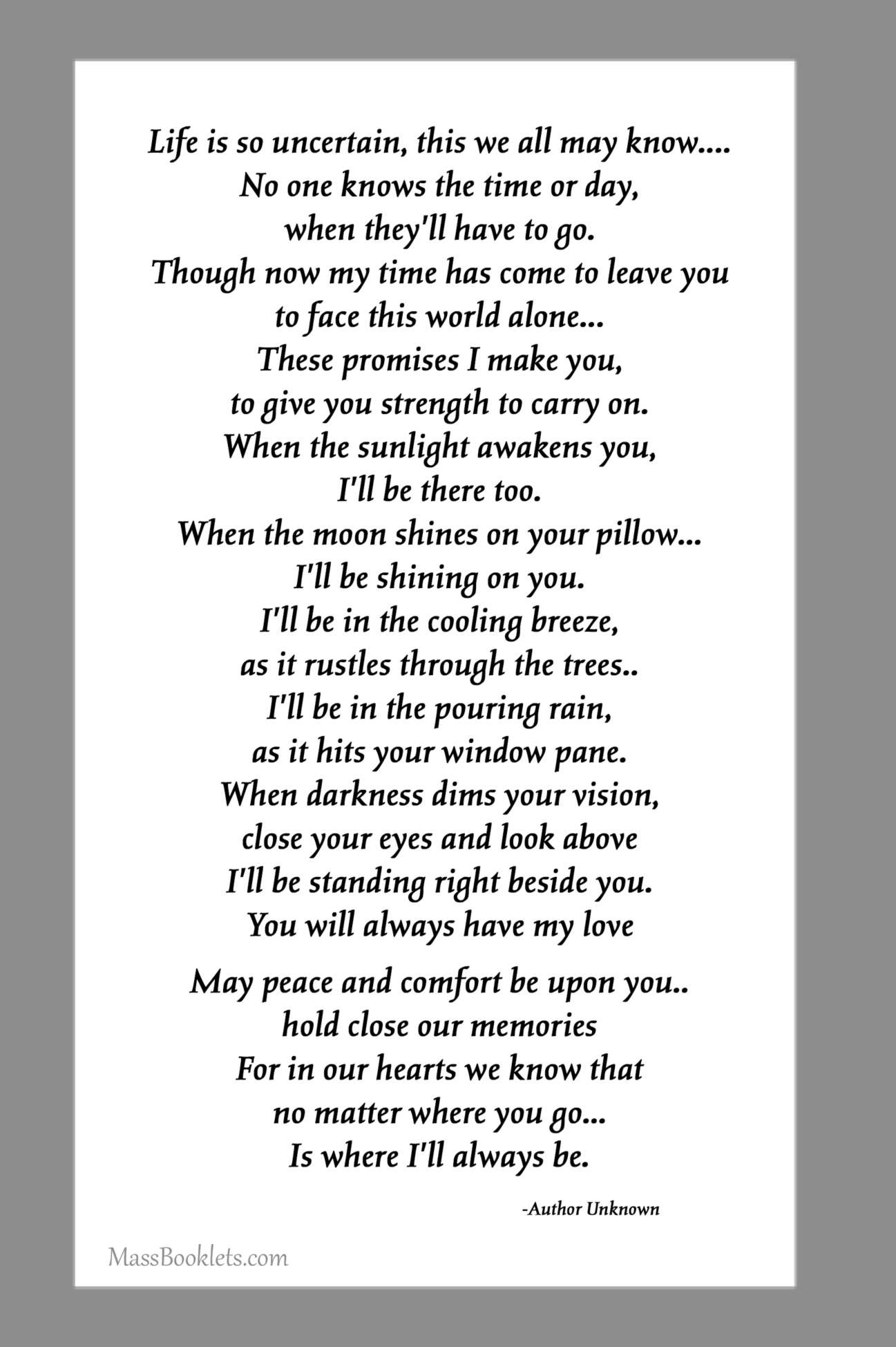 Below are some examples of Prayer Card Verses, Poems, and Prayers for Memorial card Backs. See Poems and Verses for a longer list of poems.