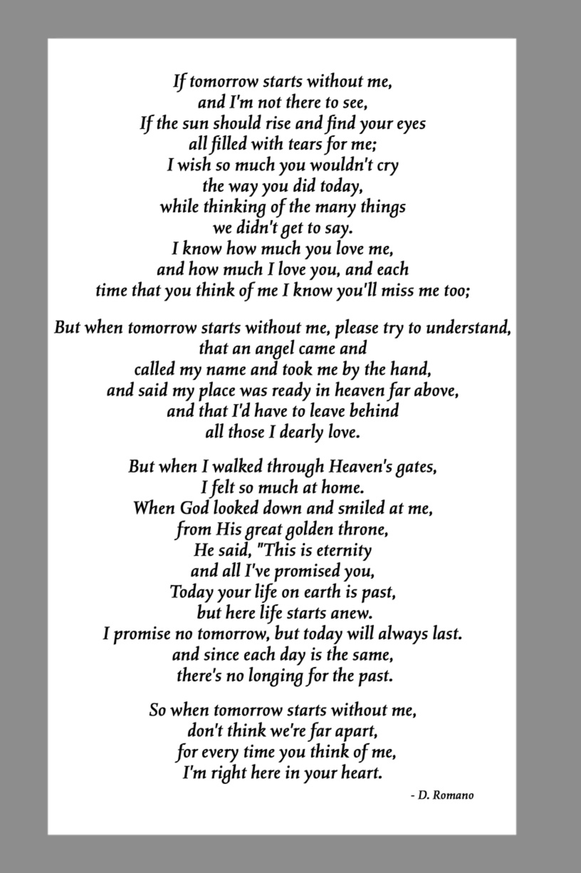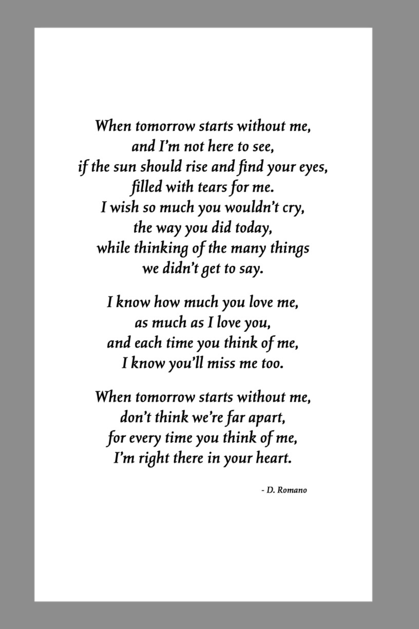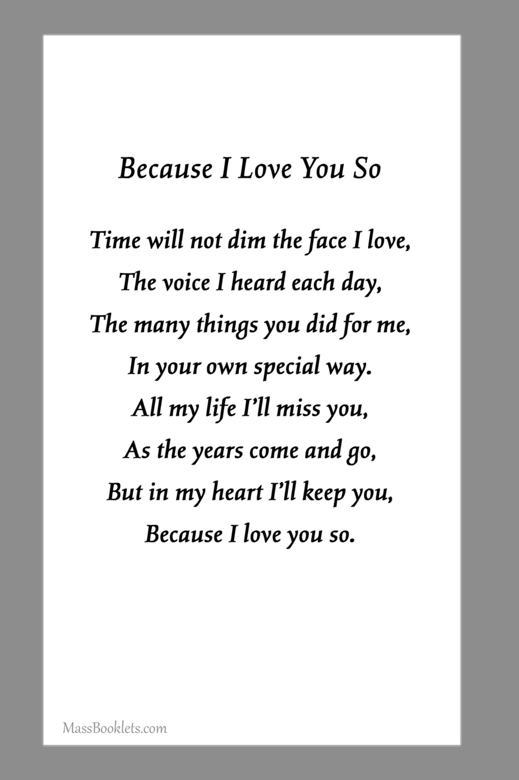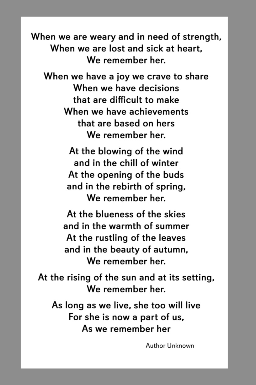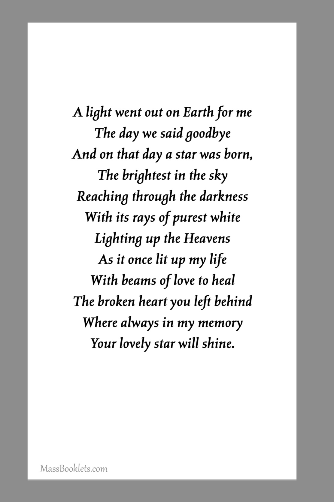 Below are some examples of Prayer Card Verses, Poems, and Prayers for Memorial card Backs. See Poems and Verses for a longer list of poems.
