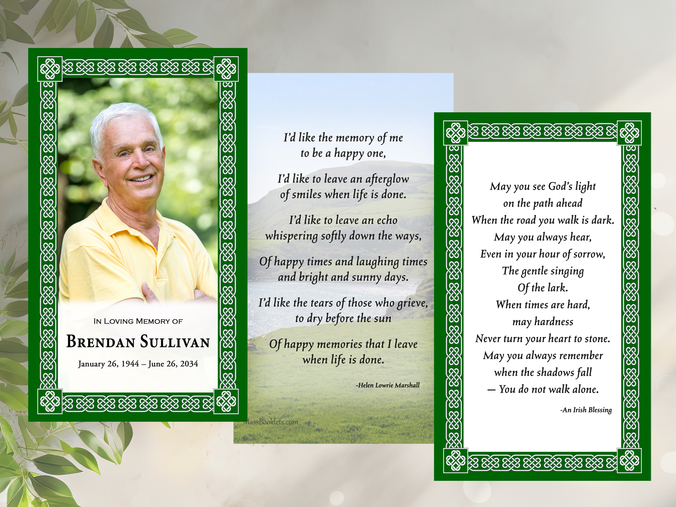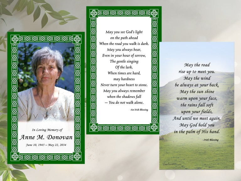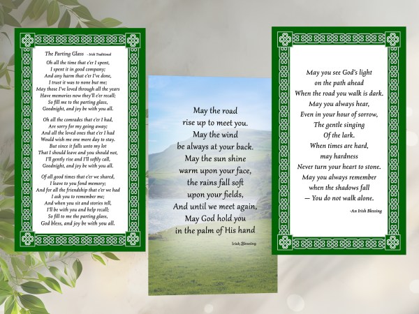 Green Celtic Heart Border Custom Prayer cards are 2.5 x 4.25 inches laser printed on cardstock (7mil Laminated)