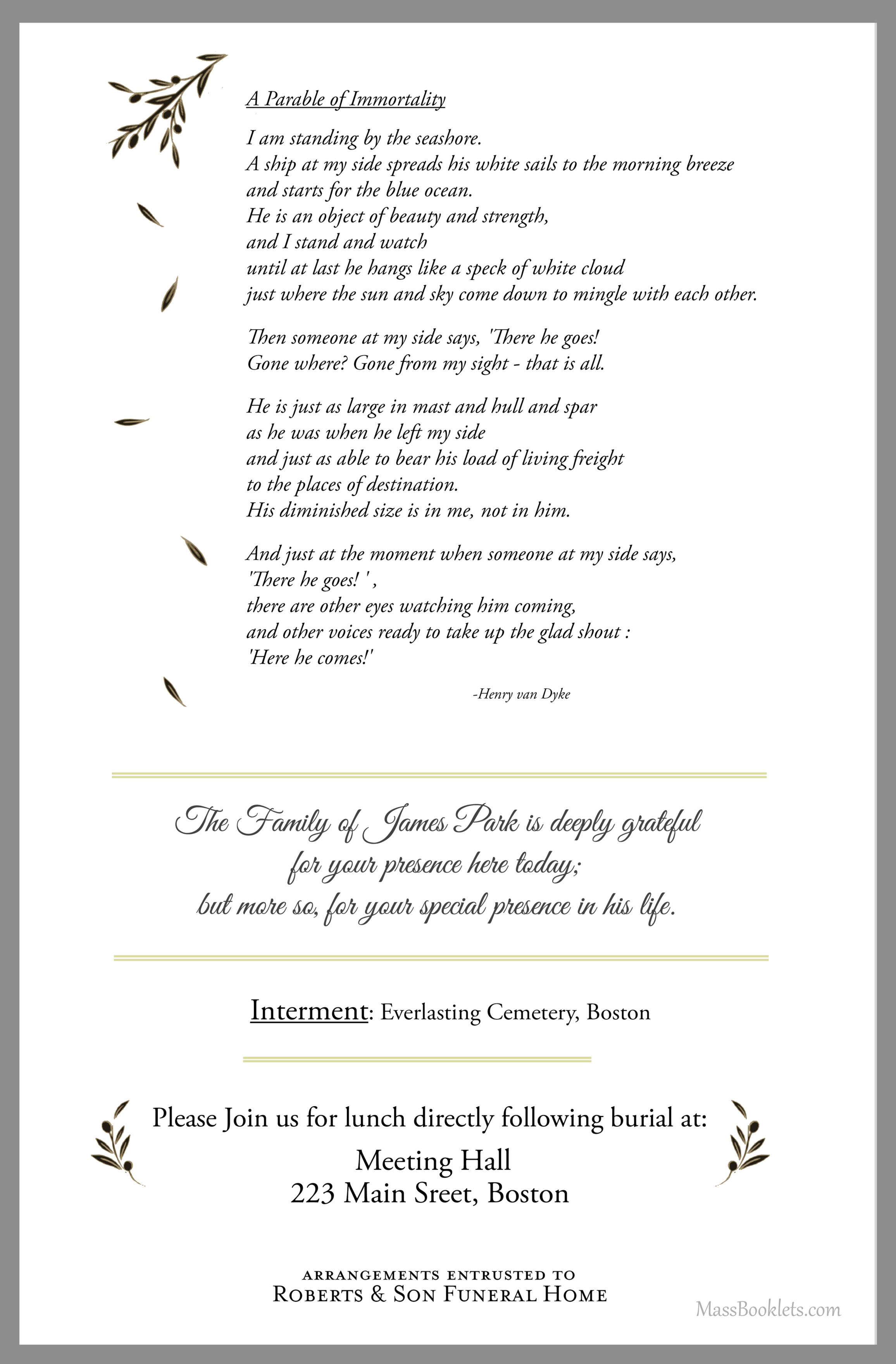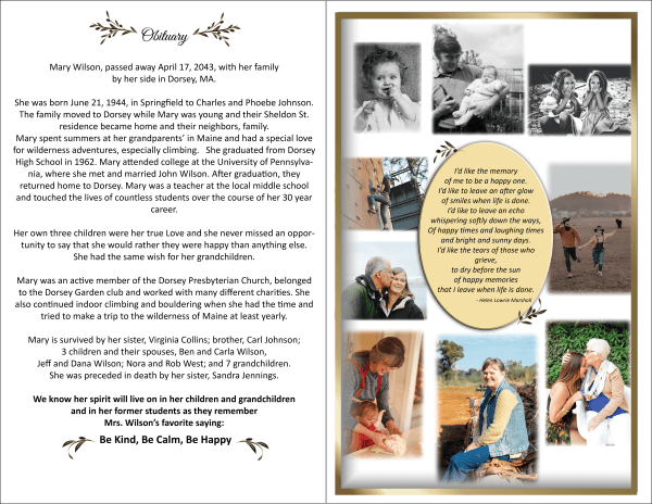 Inside includes: obituary, eulogy, or life story on one page and facing gallery page showcasing photos with or without a poem or verse.