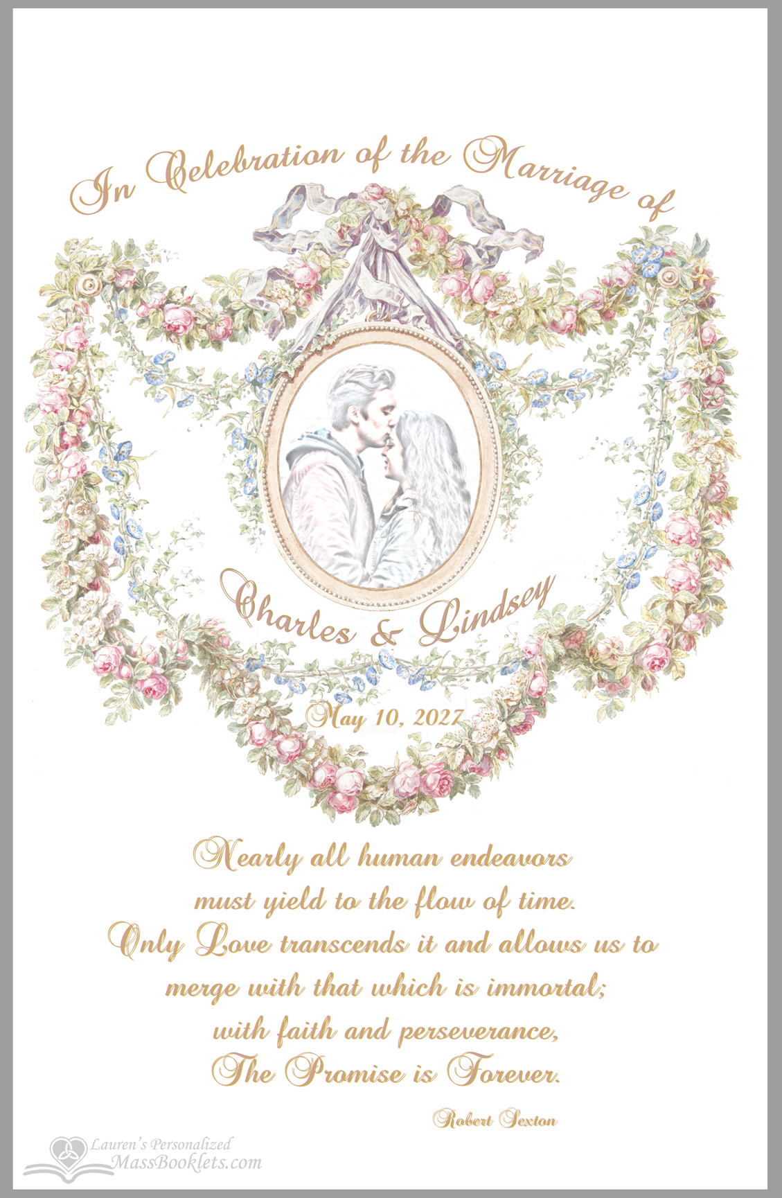 They include: Full text of Readings and Responsorial Psalm, Hymn lyrics, Names and relation of those participating in the Mass or service, text of Personalized Prayers of the Faithful, Poems and accent images. Photo or silhouette of couple can be set into frame on cover. Options to Upgrade by adding Pearlized Cover and ribbon binding or accent.