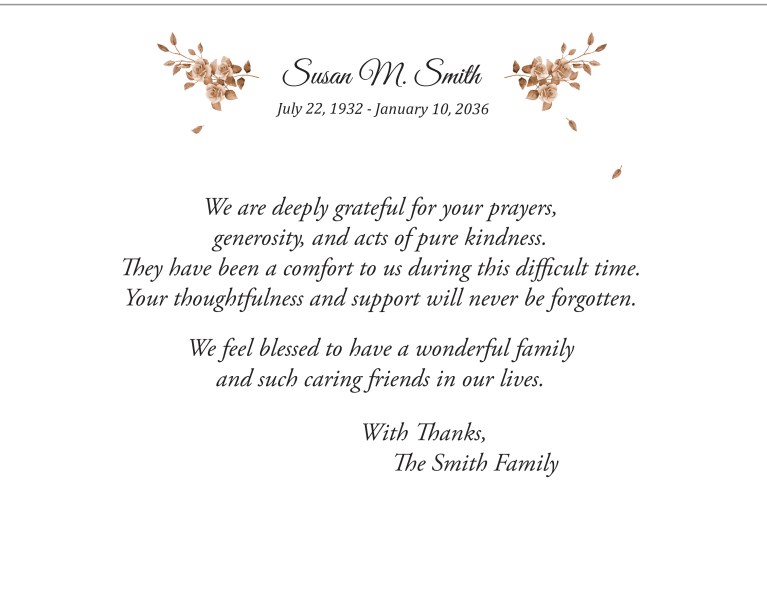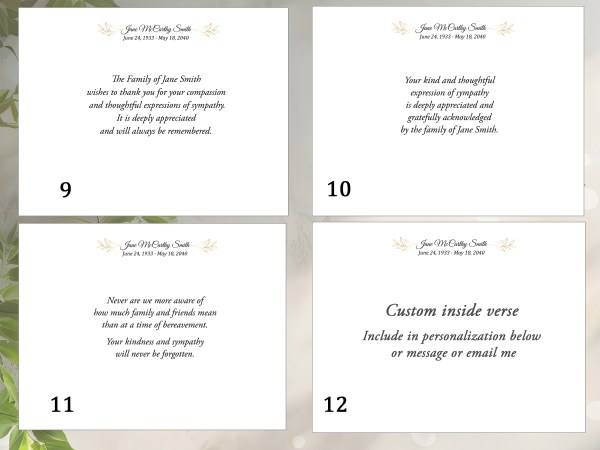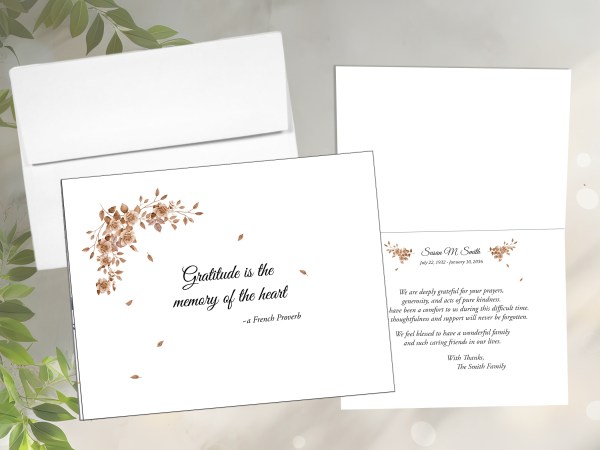 Funeral Thank You notes Size A2 folded cards (4.25″ x 5.5″) with envelopes, laser printed on 216gsm cardstock (Mohawk Via Smooth Pure White)