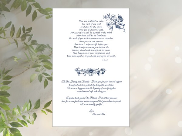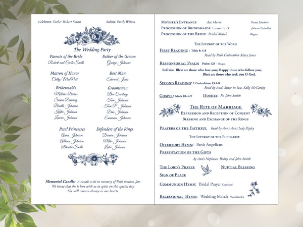 They include: Reading and Hymn titles, Names and relation of those participating in the Mass or service, Listing of Wedding Party, order of service, Poems and accent images. Option to add personalized Thank you on the back as well. Options to Upgrade by adding Pearlized Cover and ribbon accent.