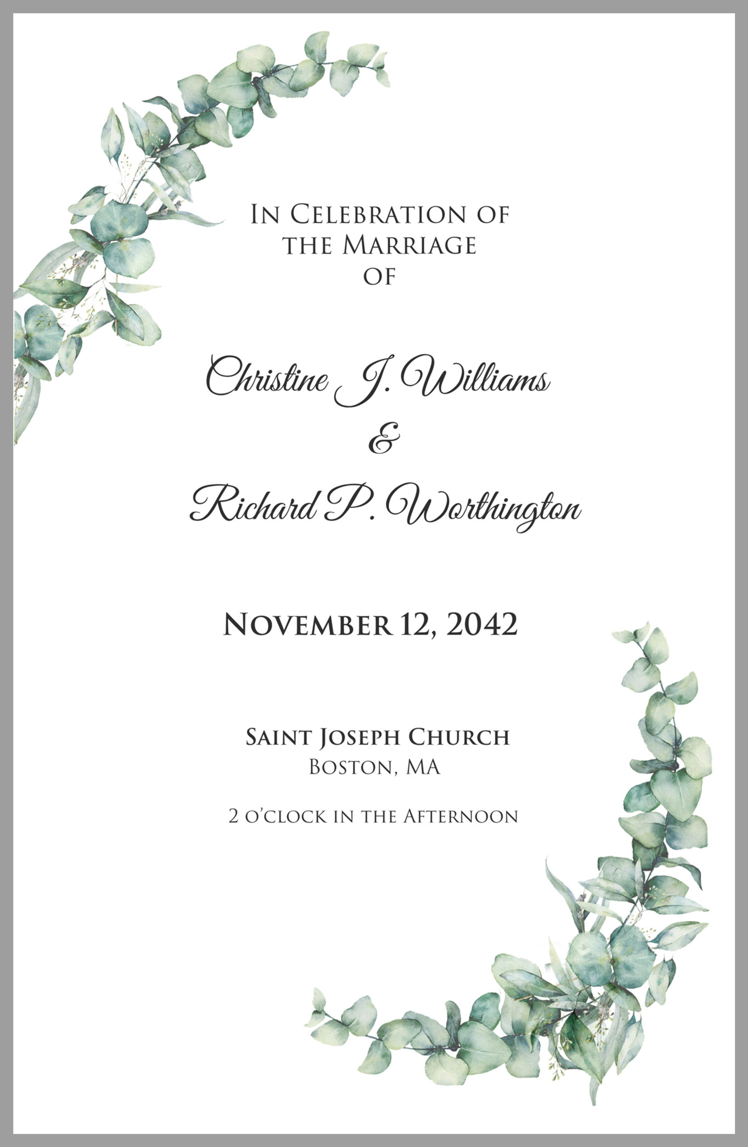 Eucalyptus Arch Custom Wedding Mass Programs contain a basic outline of the Wedding Mass